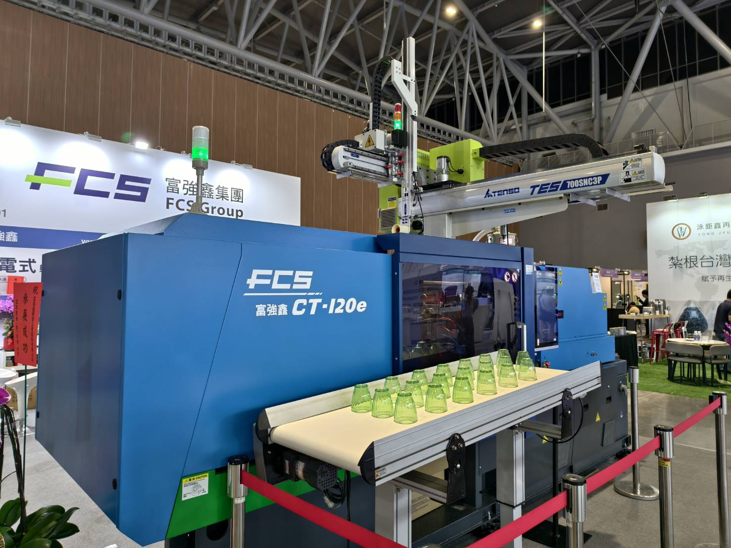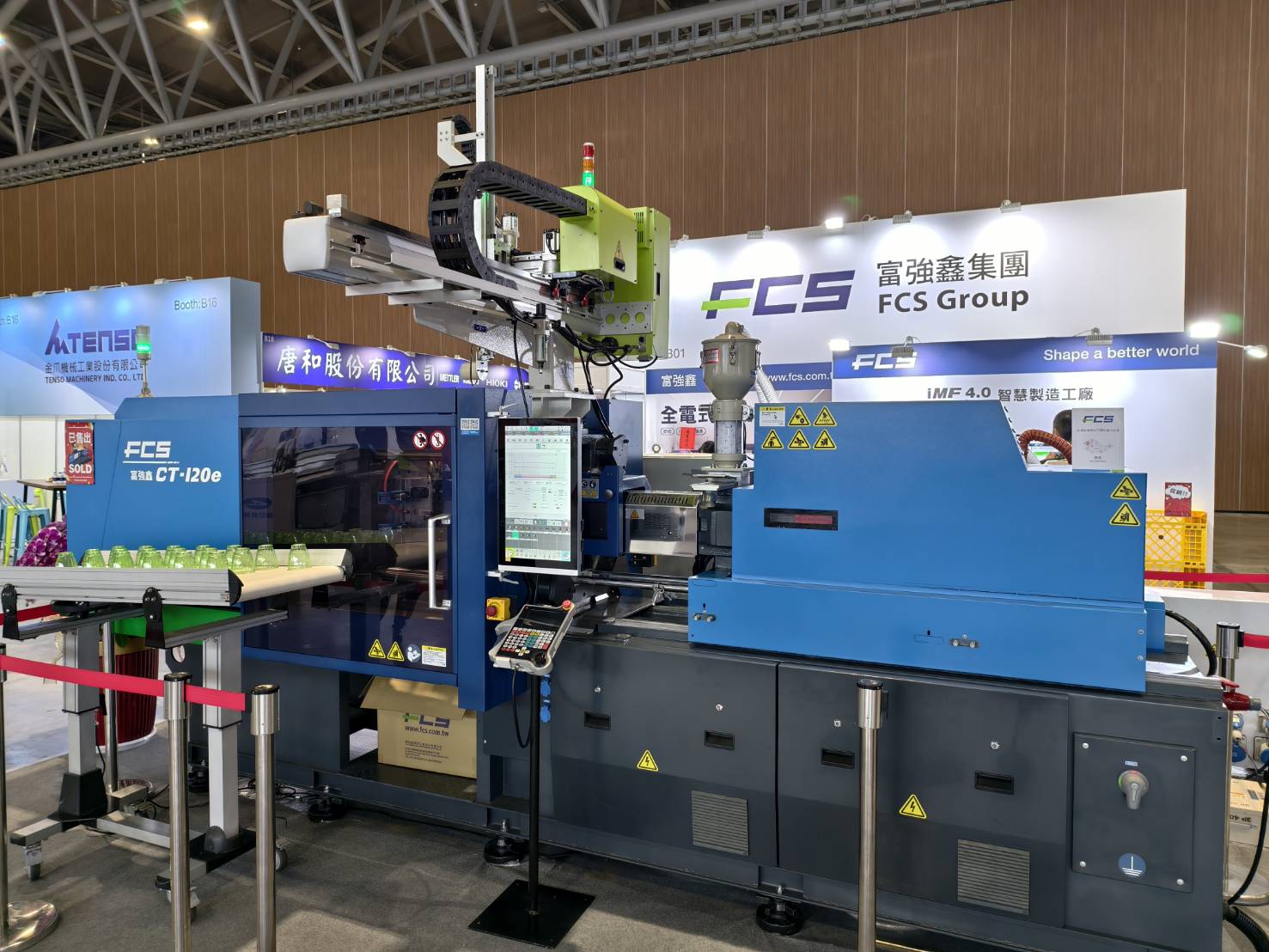 At the exhibition, FCS demonstrated the CT-120e with a clamping force of 120 tons, paired with a robotic arm to produce single-cavity PS cups (50g), showcasing its high efficiency and smart automation capabilities. The system was integrated with FCS’s proprietary iMF 4.0 Smart Manufacturing System and peripheral monitoring platform, leveraging real-time process data to achieve production transparency, energy consumption tracking, and parameter optimization. This not only significantly improves yield and efficiency but also effectively reduces energy consumption, helping customers accelerate their transition to low-carbon manufacturing and embody the new paradigm of low-carbon injection molding and green manufacturing.